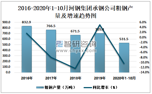 根据冶金工业信息中心数据显示:2020年1-10月河钢集团承钢公司钢材产量为523.8万吨,同比下降9.7%;粗钢产量为531.5万吨,同比下降10.4%;生铁产量为546.2万吨,同比下降8.7%。