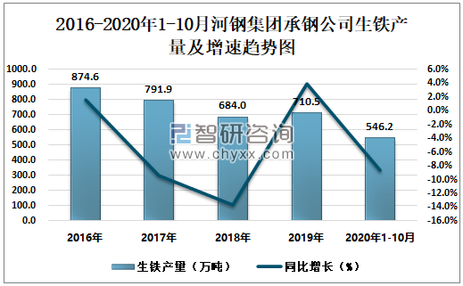 2016-2020年1-10月河钢集团承钢公司生铁产量及增速趋势图