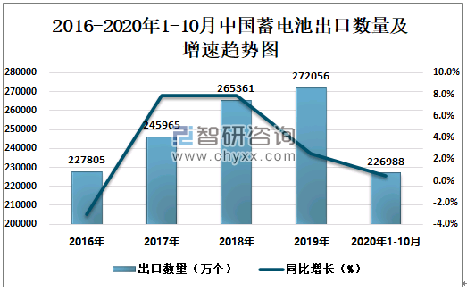 2016-2020年1-10月中国蓄电池出口数量及增速趋势图