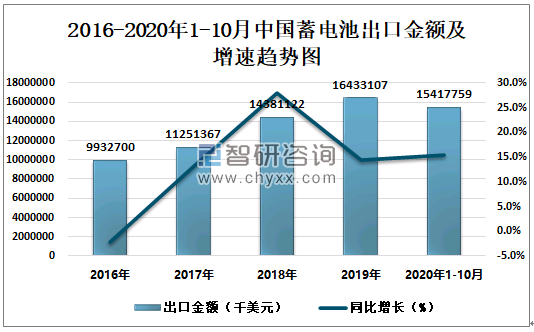 2016-2020年1-10月中国蓄电池出口金额及增速趋势图