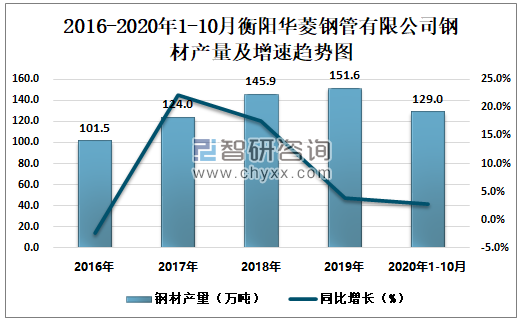 2016-2020年1-10月衡阳华菱钢管有限公司钢材产量及增速趋势图