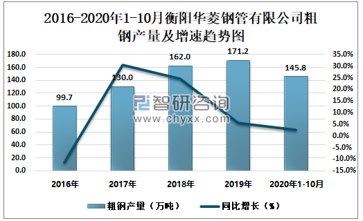 2016-2020年1-10月衡阳华菱钢管有限公司粗钢产量及增速趋势图