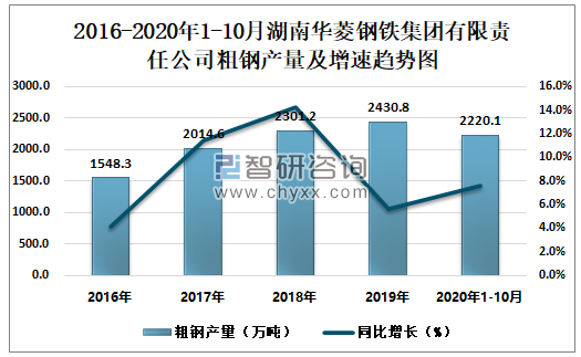 2016-2020年1-10月湖南华菱钢铁集团有限责任公司粗钢产量及增速趋势图