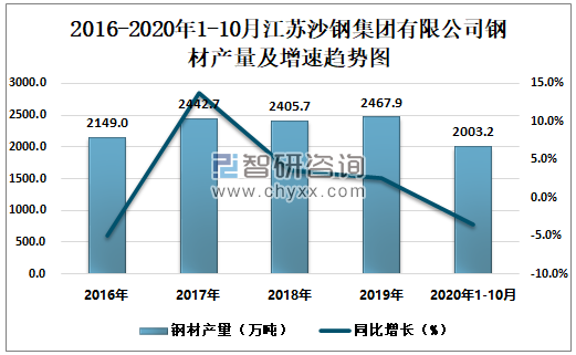 根据冶金工业信息中心数据显示:2020年1-10月江苏沙钢集团有限公司钢材产量为2003.2万吨,同比下降3.5%;粗钢产量为1910.5万吨,同比下降6.2%;生铁产量为1558.1万吨,同比下降2.5%。