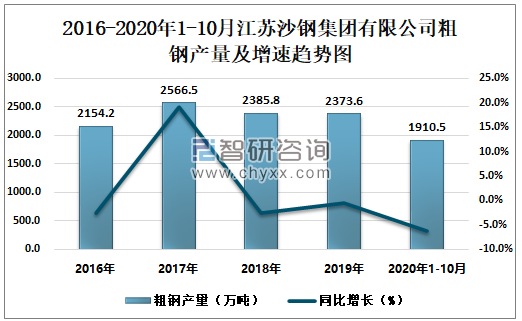 2016-2020年1-10月江苏沙钢集团有限公司粗钢产量及增速趋势图