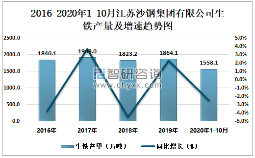 2016-2020年1-10月江苏沙钢集团有限公司生铁产量及增速趋势图