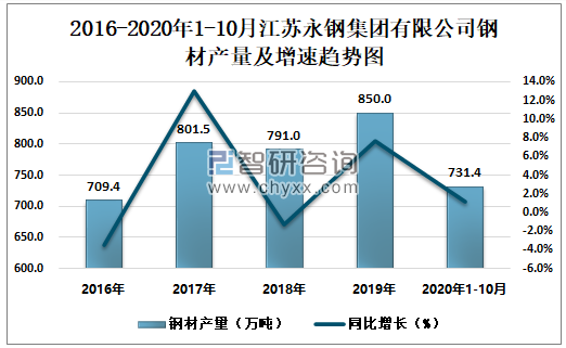 根据冶金工业信息中心数据显示:2020年1-10月江苏永钢集团有限公司钢材产量为731.4万吨,同比增长1.2%;粗钢产量为705.7万吨,同比下降3.0%;生铁产量为734.6万吨,同比下降1.6%。