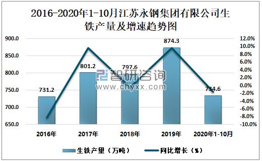 2016-2020年1-10月江苏永钢集团有限公司生铁产量及增速趋势图