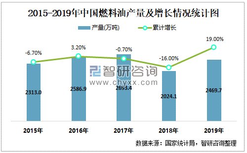 2015-2019年中国燃料油产量及增长情况统计图