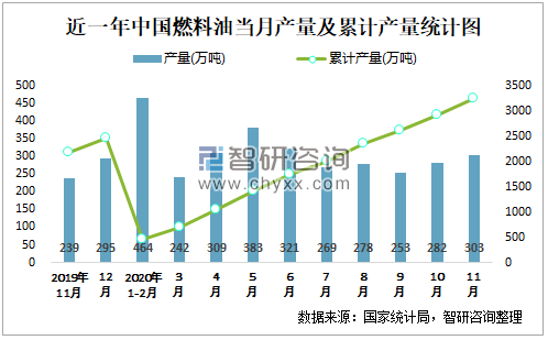 根据国家统计局数据显示:2020年11月中国燃料油产量为303万吨,同比增长20.8%;2020年1-11月中国燃料油累计产量为3239.1万吨,累计增长42.2%;2015-2019年中国燃料油产量2018年跌至最低,此后有所回升。
