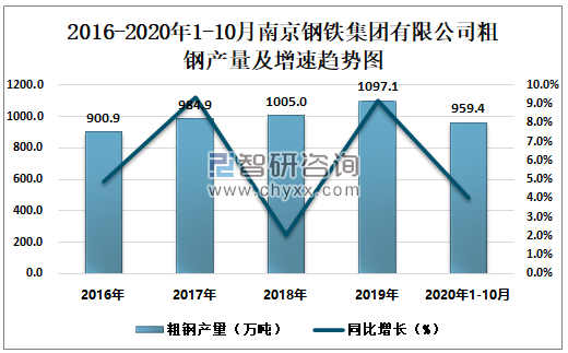 根据冶金工业信息中心数据显示:2020年1-10月南京钢铁集团有限公司钢材产量为847.6万吨,同比增长0.5%;粗钢产量为959.4万吨,同比增长4.0%;生铁产量为868.4万吨,同比增长5.2%。