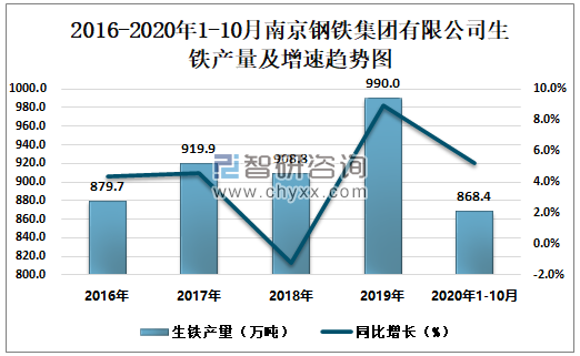2016-2020年1-10月南京钢铁集团有限公司生铁产量及增速趋势图