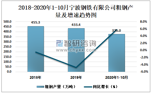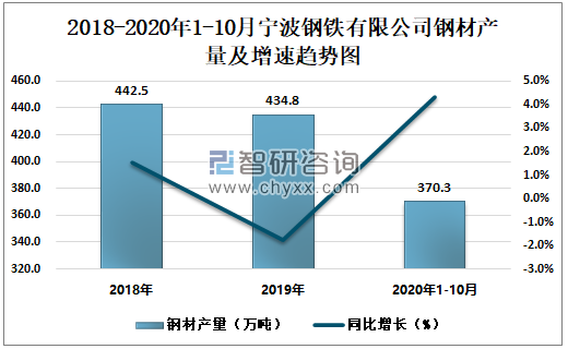 2018-2020年1-10月宁波钢铁有限公司钢材产量及增速趋势图