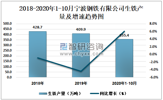 2018-2020年1-10月宁波钢铁有限公司生铁产量及增速趋势图