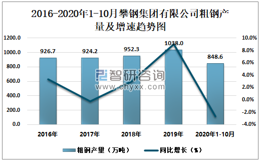 2016-2020年1-10月攀钢集团有限公司粗钢产量及增速趋势图