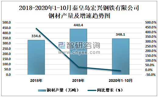 2018-2020年1-10月秦皇岛宏兴钢铁有限公司钢材产量及增速趋势图