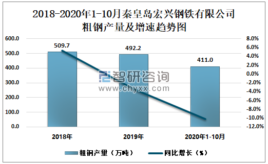 2018-2020年1-10月秦皇岛宏兴钢铁有限公司粗钢产量及增速趋势图