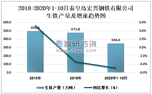 2018-2020年1-10月秦皇岛宏兴钢铁有限公司生铁产量及增速趋势图