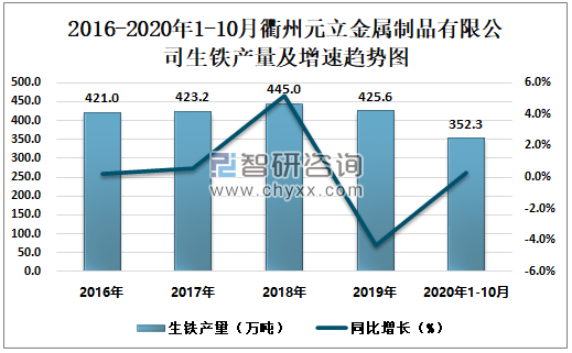 2016-2020年1-10月衢州元立金属制品有限公司生铁产量及增速趋势图