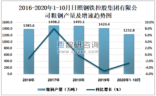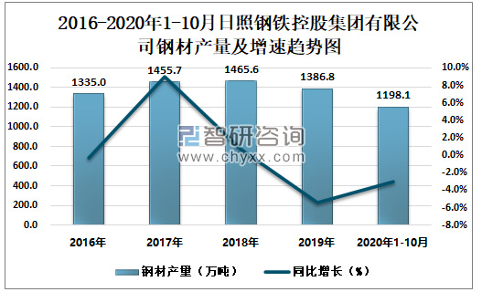根据冶金工业信息中心数据显示:2020年1-10月日照钢铁控股集团有限公司钢材产量为1198.1万吨,同比下降3.1%;粗钢产量为1232.8万吨,同比下降2.6%;生铁产量为1092.5万吨,同比下降7.7%。