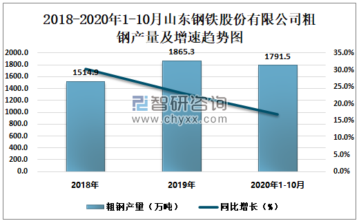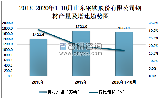 根据冶金工业信息中心数据显示:2020年1-10月山东钢铁股份有限公司钢材产量为1660.9万吨,同比增长17.1%;粗钢产量为1791.5万吨,同比增长16.8%;生铁产量为1735.0万吨,同比增长13.9%。