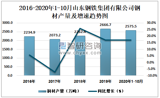 2016-2020年1-10月山东钢铁集团有限公司钢材产量及增速趋势图