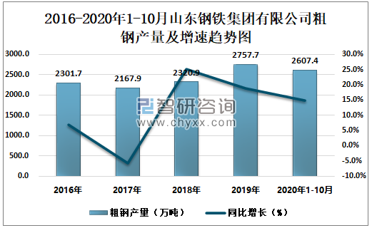 根据冶金工业信息中心数据显示:2020年1-10月山东钢铁集团有限公司钢材产量为2575.5万吨,同比增长17.2%;粗钢产量为2607.4万吨,同比增长14.8%;生铁产量为2432.1万吨,同比增长12.3%。