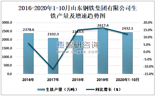 2016-2020年1-10月山东钢铁集团有限公司生铁产量及增速趋势图