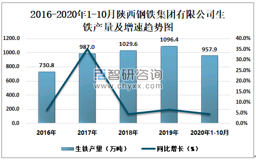 2016-2020年1-10月陕西钢铁集团有限公司生铁产量及增速趋势图