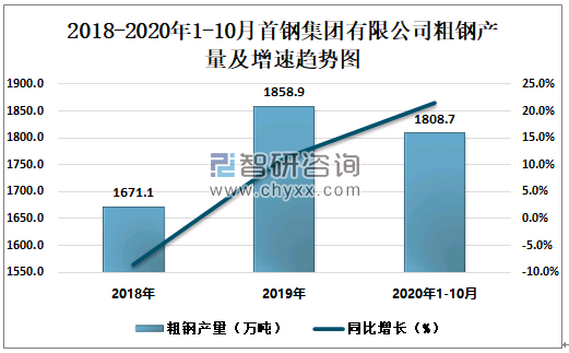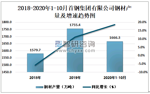 根据冶金工业信息中心数据显示:2020年1-10月首钢集团有限公司钢材产量为1666.3万吨,同比增长18.7%;粗钢产量为1808.7万吨,同比增长21.6%;生铁产量为1720.1万吨,同比增长24.2%。