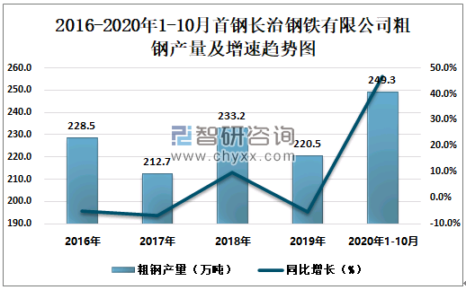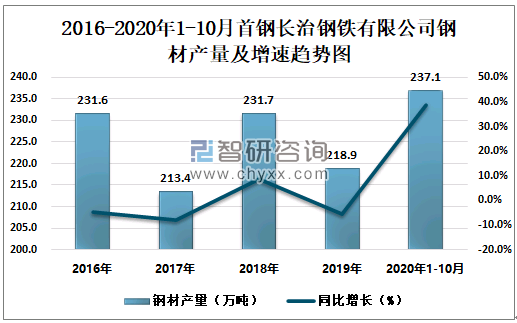 根据冶金工业信息中心数据显示:2020年1-10月首钢长治钢铁有限公司钢材产量为237.1万吨,同比增长38.7%;粗钢产量为249.3万吨,同比增长46.8%;生铁产量为212.8万吨,同比增长47.8%。