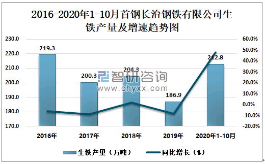2016-2020年1-10月首钢长治钢铁有限公司生铁产量及增速趋势图