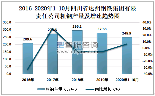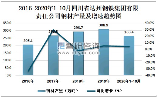 根据冶金工业信息中心数据显示:2020年1-10月四川省达州钢铁集团有限责任公司钢材产量为263.4万吨,同比增长4.3%;粗钢产量为248.9万吨,同比增长6.5%;生铁产量为201.2万吨,同比下降0.3%。