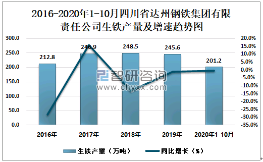 2016-2020年1-10月四川省达州钢铁集团有限责任公司生铁产量及增速趋势图