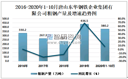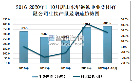根据冶金工业信息中心数据显示:2020年1-10月唐山东华钢铁企业集团有限公司钢材产量为258.9万吨,同比增长4.0%;粗钢产量为380.2万吨,同比增长8.4%;生铁产量为381.5万吨,同比增长27.0%。