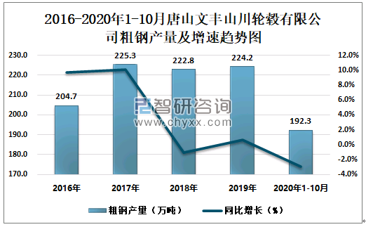 2016-2020年1-10月唐山文丰山川轮毂有限公司粗钢产量及增速趋势图