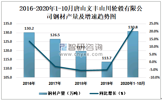 2016-2020年1-10月唐山文丰山川轮毂有限公司钢材产量及增速趋势图