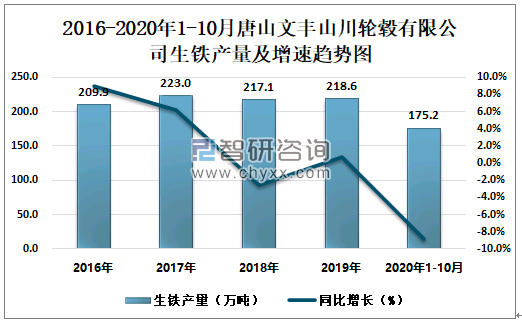 2016-2020年1-10月唐山文丰山川轮毂有限公司生铁产量及增速趋势图