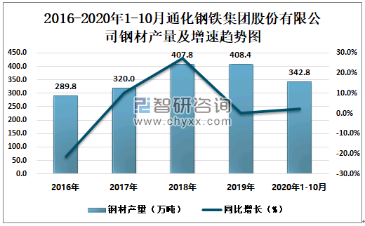 2016-2020年1-10月通化钢铁集团股份有限公司钢材产量及增速趋势图