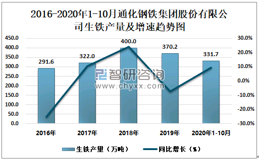 2016-2020年1-10月通化钢铁集团股份有限公司生铁产量及增速趋势图