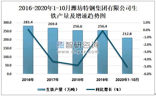 根据冶金工业信息中心数据显示:2020年1-10月潍坊特钢集团有限公司钢材产量为211.5万吨,同比下降7.2%;粗钢产量为219.8万吨,同比下降5.6%;生铁产量为212.8万吨,同比下降5.0%。