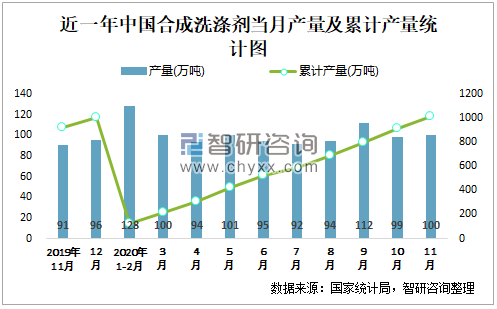根据国家统计局数据显示:2020年11月中国合成洗涤剂产量为100万吨,同比增长9.1%;2020年1-11月中国合成洗涤剂累计产量为1008.9万吨,累计增长7.6%;2015-2019年中国合成洗涤剂产量2018年跌至最低值,此后有所回升。