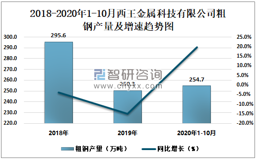 根据冶金工业信息中心数据显示:2020年1-10月西王金属科技有限公司钢材产量为244.6万吨,同比增长19.1%;粗钢产量为254.7万吨,同比增长19.6%;生铁产量为216.4万吨,同比增长12.6%。
