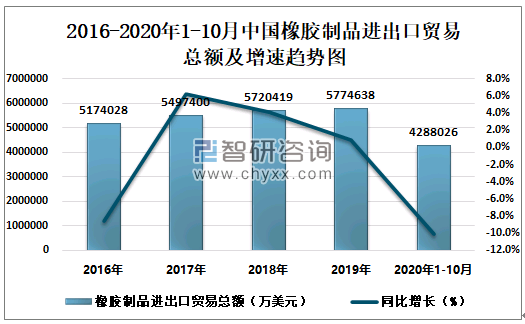2016-2020年1-10月中国橡胶制品进出口贸易总额及增速趋势图