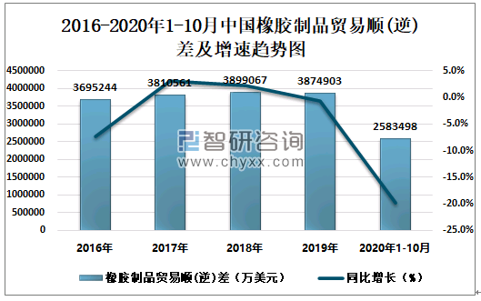 2016-2020年1-10月中国橡胶制品贸易顺(逆)差及增速趋势图