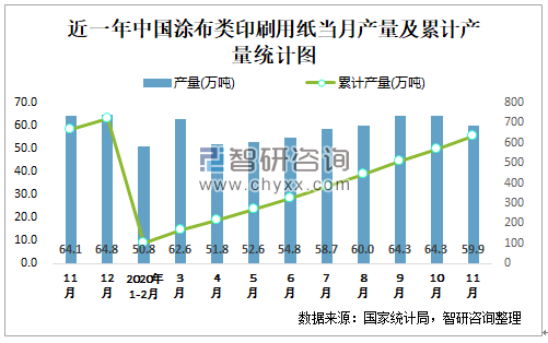 近一年中国涂布类印刷用纸当月产量及累计产量统计图