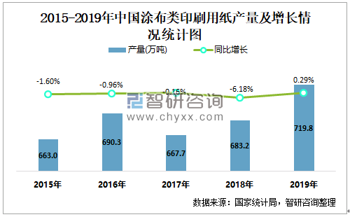 2015-2019年中国涂布类印刷用纸产量及增长情况统计图