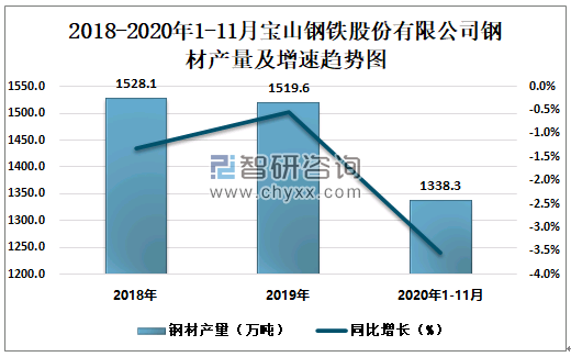 2018-2020年1-11月宝山钢铁股份有限公司钢材产量及增速趋势图