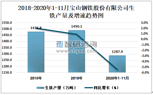 2018-2020年1-11月宝山钢铁股份有限公司生铁产量及增速趋势图