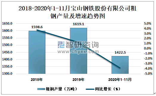 2018-2020年1-11月宝山钢铁股份有限公司粗钢产量及增速趋势图